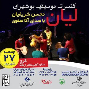موسیقی ما – کنسرت خیریه «لیان» در استان البرز برگزار خواهد شد. این گروه بوشهری به سرپرستی «محسن شریفیان» و خوانندگی «آکا صفوی» روز 27 شهریور و طی دو سانس در سالن سینما تئاتر ارشاد شهر کرج روی صحنه میرود. این برنامه با همت بنیاد خیریه «فیروزنیا» اجرا میشود و قرار است که بخشی از عواید حاصل از آن به زنان بی سرپرست اختصاص یابد. علاقه مندان برای تهیه بلیت میتوانند علاوه بر تماس با این بنیاد خیریه به شماره 88520554 از طریق سامانه ایران کنسرت هم اقدام نمایند. محسن شریفیان و گروهش از فعالان پیشرو در زمینه ارائه موسیقی منطقه جنوب ایران هستند.