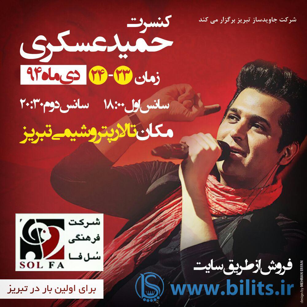 موسیقی ما – خواننده آلبوم «از عشق» برای اولین بار به خطه آذربایجان سفر خواهد کرد. «حمید عسکری» در ادامه تور کنسرتهایش طی روزهای 23 و 24 دی در تالار پتروشیمی شهر تبریز روی صحنه میرود. این برنامه طی چهار سانس و با همت شرکت «سلفا» به مدیریت «مجید طوسی» و شرکت «جاویدساز تبریز» برگزار میشود. علاقهمندان برای تهیه بلیت میتوانند به سامانه اینترنتی www.bilits.ir مراجعه و صندلی مورد نظر خود را انتخاب نمایند. حمید عسکری از ابتدای ماه دی تور کنسرتهای خود را آغاز کرده و چندی پیش هم در شهر گرگان اجرای زنده داشت. البته کنسرت این خواننده که قرار بود در شهر «فریمان» برگزار شود به دستور دادستانی لغو شد.