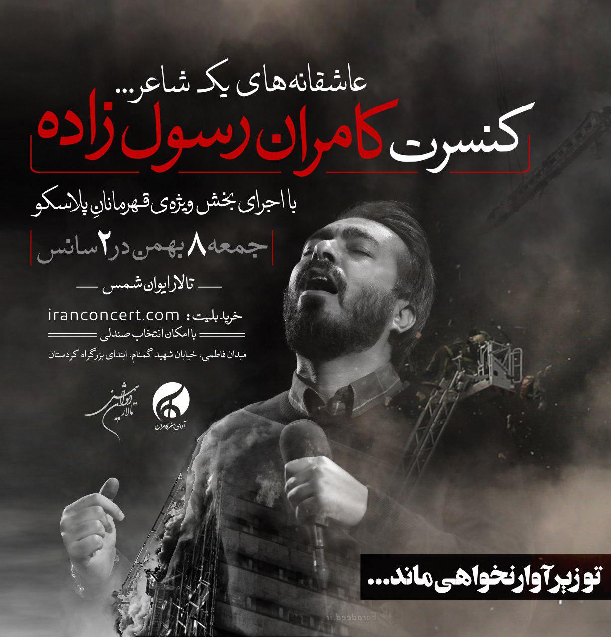 موسیقی ما - «کامران رسولزاده» جدیدترین کنسرتش را به یاد آتشنشانان قهرمان فاجعه پلاسکو روی صحنه میبرد. اجرای زنده این خواننده روز هشتم بهمنماه و طی دو سانس در تالار «ایوان شمس» برگزار میشود و کنسرت او همزمان با هفتمین روز درگذشت فاجعه فروریختن ساختمان پلاسکو است. تیم هنری این برنامه به کارگردانی یکی از چهرههای مطرح تئاتر، اتفاق نمایشی ویژهای برای پاسداشت رشادتهای آتشنشانان فداکار تدارک دیدهاند. همچنین عواید حاصل از این کنسرت برای شادی روح شهدا و سایر درگذشتگان و به نیت بهبودی مصدومین فاجعه پلاسکو، به موسسات حامی کودکان کار اختصاص پیدا خواهد کرد.