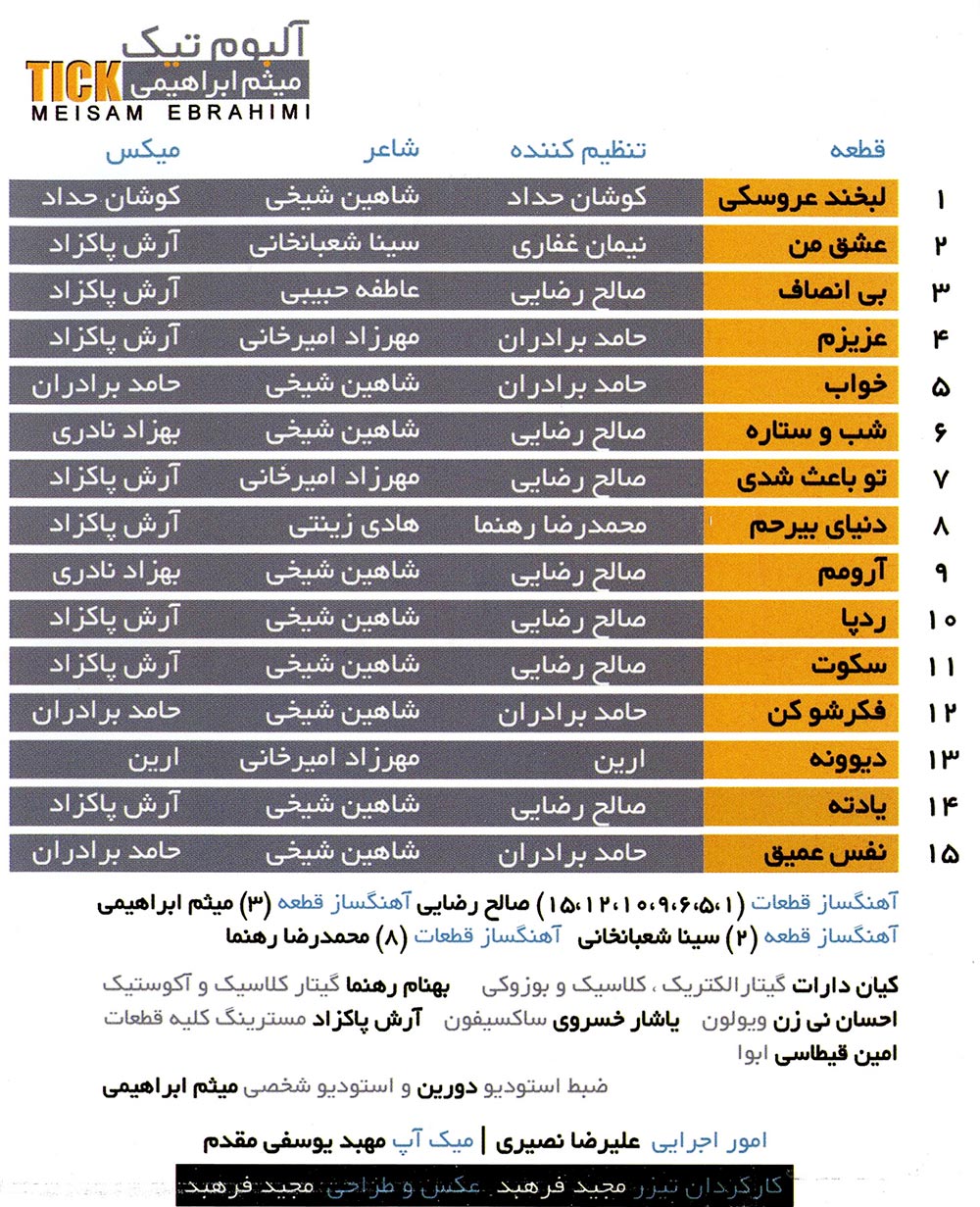 آلبوم «تیک» 15 قطعه دارد که «لبخند عروسکی»، «عشق من»، «بی انصاف»، «عزیزم»، «خواب»، «شب و ستاره»، «تو باعث شدی»، «دنیای بیرحم»، «آرومم»، «رد پا»، «سکوت»، «فکرشو کن»، «دیوونه»، «یادته» و «نفس عمیق» نام دارند.