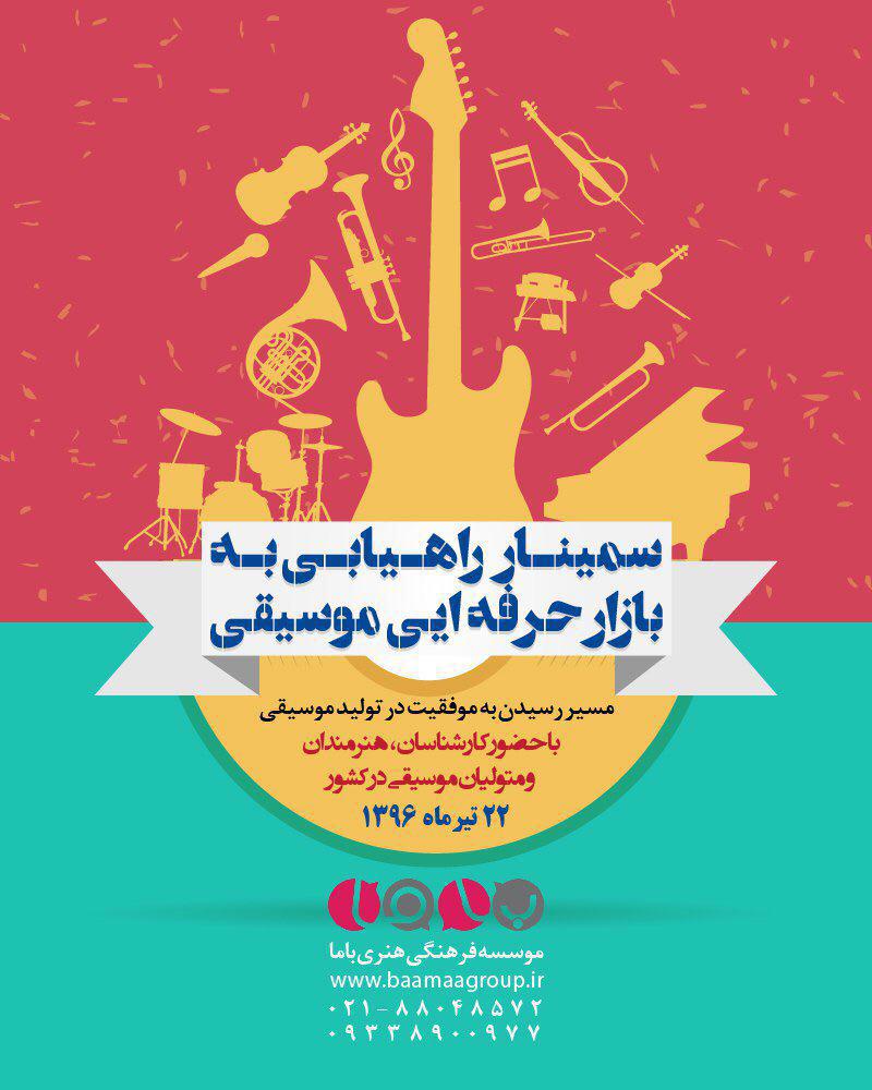 «سمینار راهیابی به بازار حرفهای موسیقی» (مخاطبشناسی، مارکتینگ و کسب درآمد) از ساعت 14 روز 22 تیرماه به مدت شش ساعت برگزار خواهد شد. این برنامه به همت مؤسسه فرهنگی-هنری «باما» با مشارکت سایت «موسیقی ما» و دفتر موسیقی وزارت فرهنگ و ارشاد اسلامی تدارک دیده شده است. تالار فرهنگسرای اندیشه (واقع در خیابان شریعتی، نرسیده به سیدخندان)، میزبان این سمینار خواهد بود و «هیراد حاتمی» (مجری تلویزیون و ترانهسرا) اجرایبرنامه را به عهده دارد. علاقهمندان برای تهیه بلیت میتوانند به سایت «تیوال» مراجعه یا با شماره تلفن 88048572 تماس حاصل کنند.