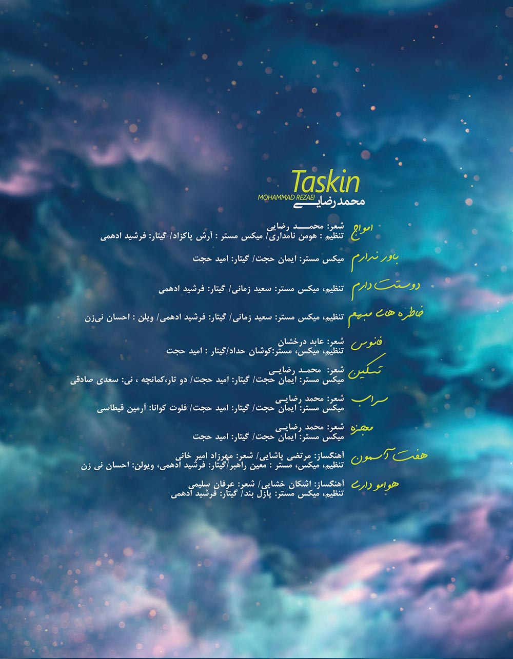 آلبوم تسکین اثر جدید محمد رضایی شامل ده آهنگ پاپ است. اکثر آهنگهای این آلبوم فضایی عاشقانه و غمگین دارند. نوازندگانی همچون فرشید ادهمی، امید حجت، احسان نی زن، سعدی صادقی و آرمین قیطاسی در این آلبوم هنرنمایی کرده اند.