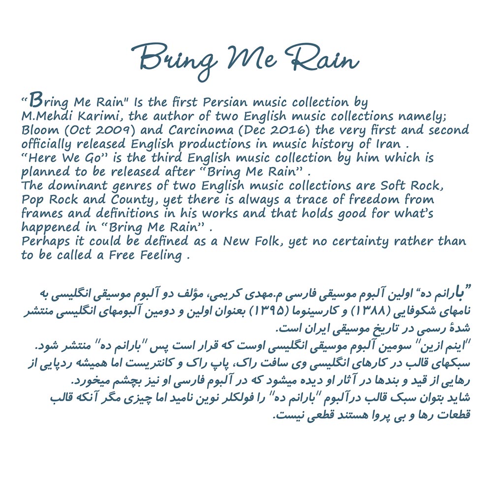 آلبوم بارانم ده اثری است با آهنگسازی، ترانه‌سرایی و خوانندگی م.مهدی کریمی. این هنرمند پیش از این دو آلبوم انگلیسی به نام‌های شکوفایی و کارسینوما منتشر کرده بود. سبکهای قالب در کارهای انگلیسی وی سافت راک، پاپ راک و کانتری است اما همیشه رد پایی از رهایی از قید و بندها در آثار او دیده میشود که در آلبوم فارسی او نیز به چشم می‌خورد. تا امروز نوازندگی، تنظیم و میکس و مسترینگ در همۀ آثار وی توسط علی امیری فیروزکوهی انجام شده است.